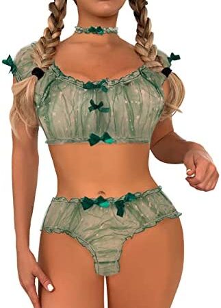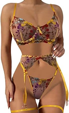 Women Fashion Print Mesh Lingerie Lace Lingerie Three Pieces Set Sexy Underwear with Ring New Years Lingerie Push