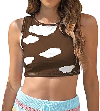 Women Casual Spring Summer Short Tight Vest Round Neck Cloud Print Sexy Navel Vest Nylon Tops Women