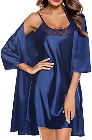 SWOMOG Womens Satin Robes Set Silk Pajamas Sets 2 Piece Lace Cami Nightgown with Robes Sleepwear Bridesmiad Wedding Kimonos