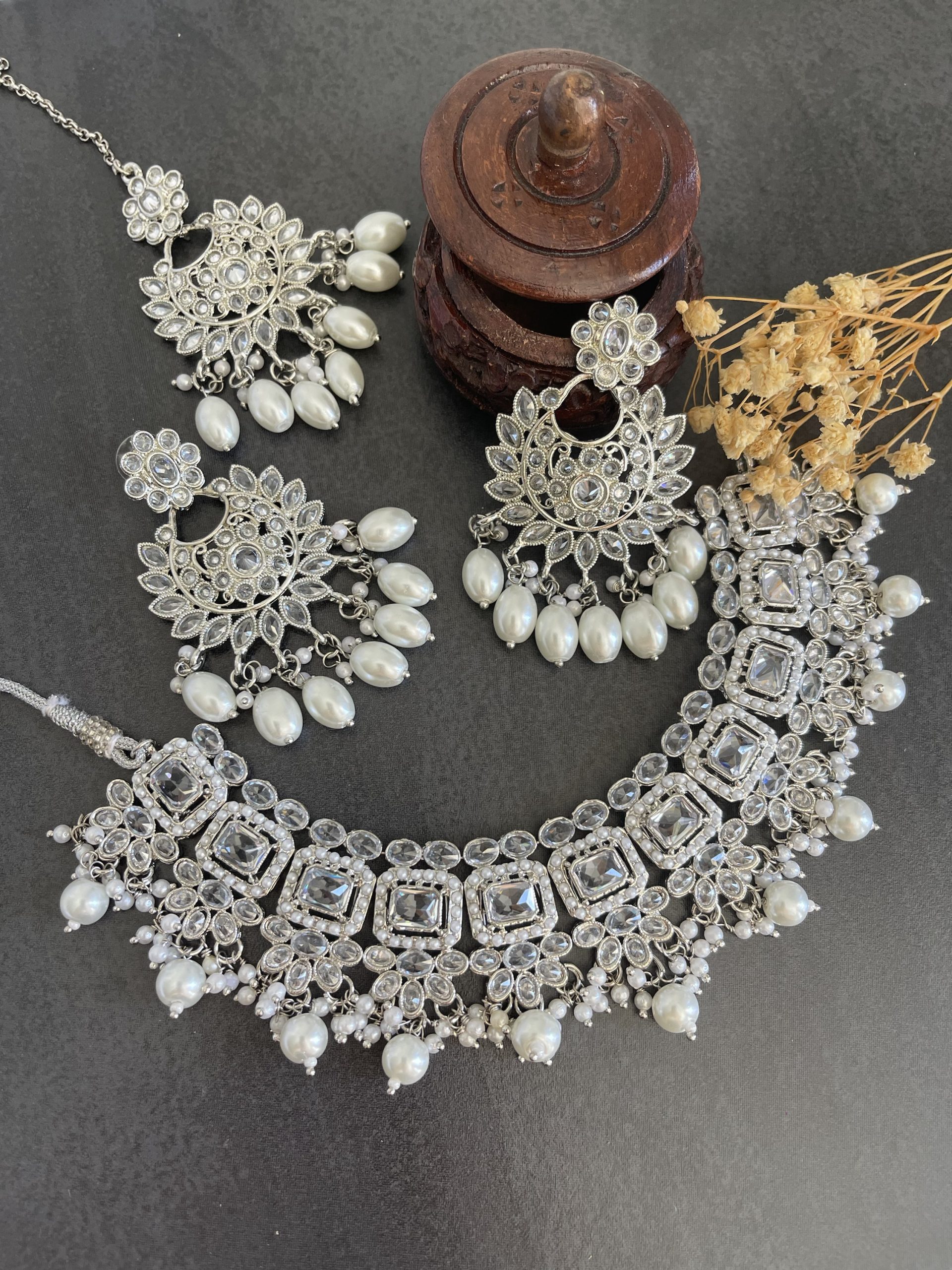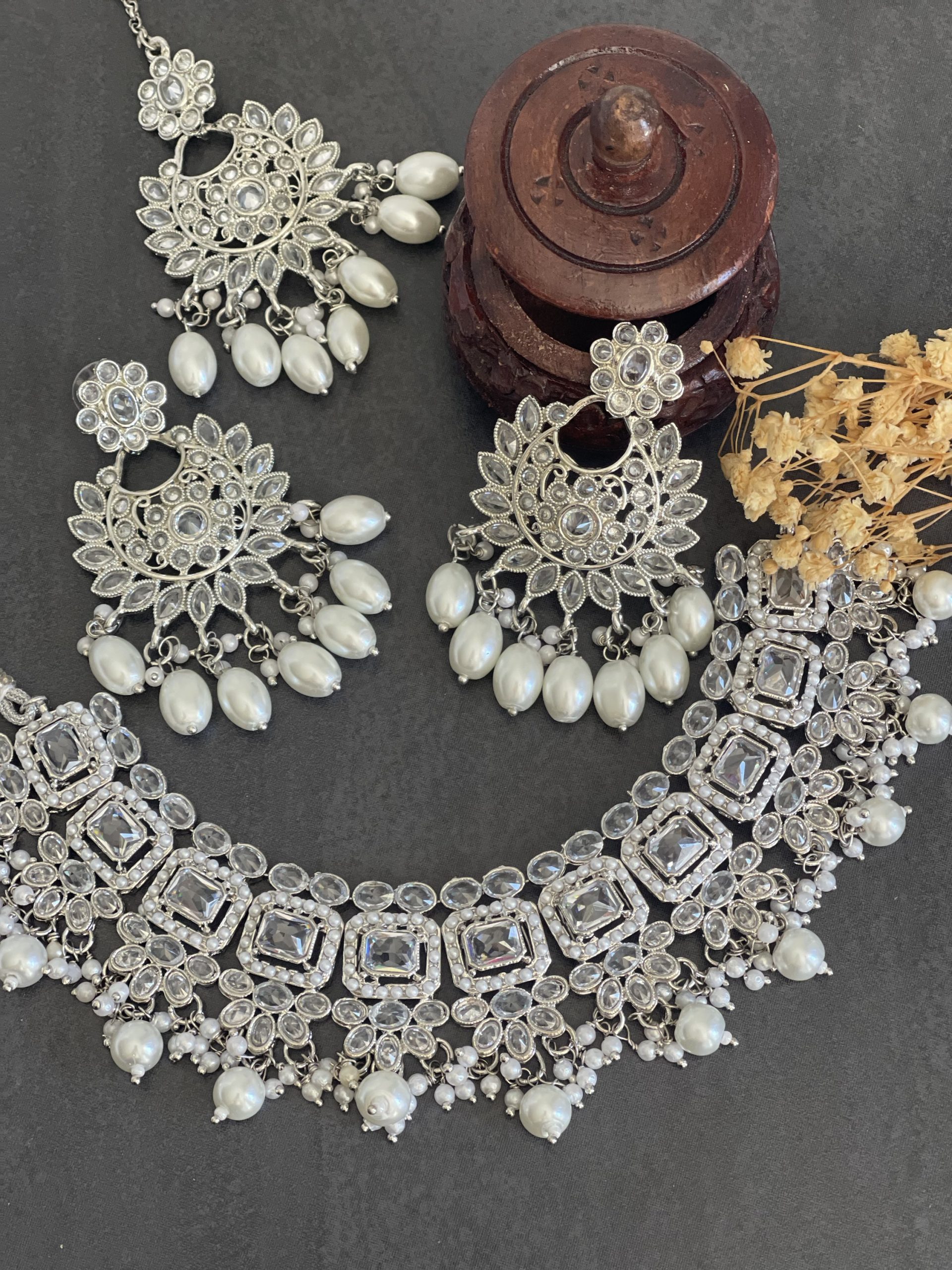 Introducing our exquisite Artificial Reverse Polki Necklace Set, adorned with traditional Chandbali earrings and a matching Tikka. Crafted with meticulous attention to detail, this set combines elegance and charm, perfect for adding a touch of regal splendor to any occasion. Delicately designed to capture the essence of timeless beauty, this set is sure to be a cherished addition to your jewelry collection. Elevate your ensemble with this stunning ensemble that effortlessly blends tradition with contemporary flair.